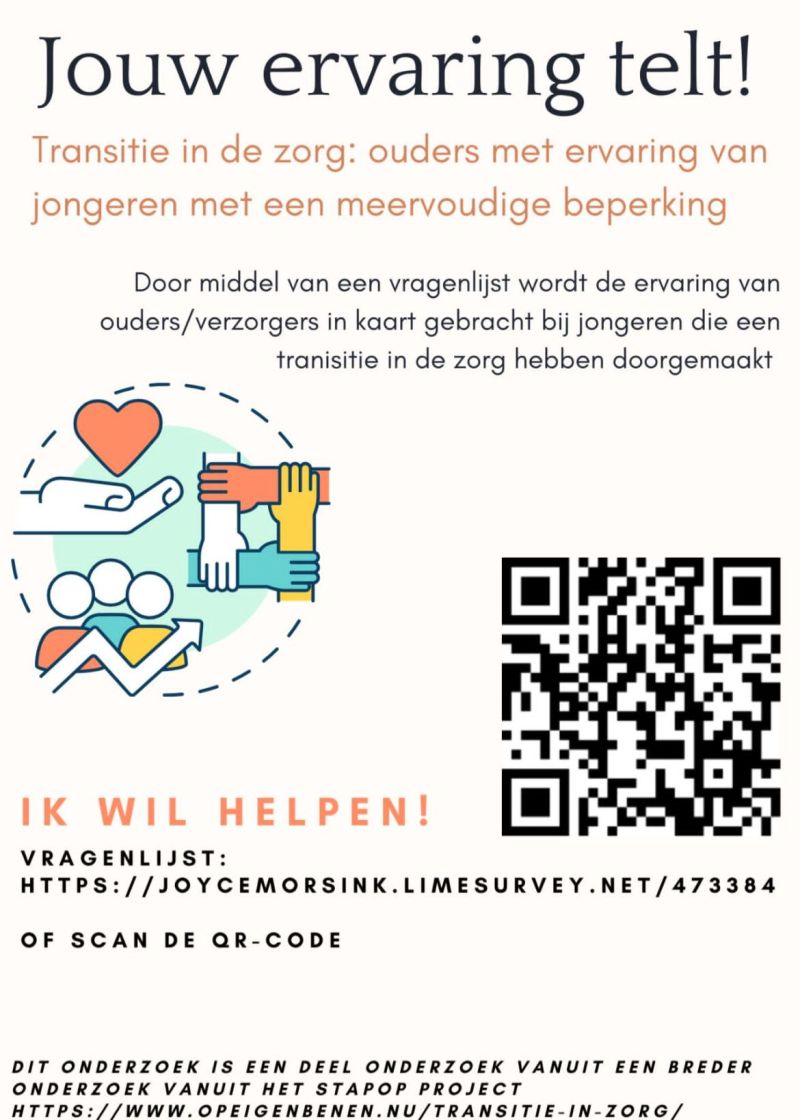 Een belangrijk onderdeel van het project is het onderzoek van Joyce Morsink, derdejaarsstudent kinderfysiotherapie aan de Hogeschool Rotterdam, naar de overgang van kindzorg naar volwassenenzorg, maar dan specifiek voor jongeren met (ernstige) meervoudige beperkingen. Daarvoor is input nodig van ouders en verzorgers van jongeren die de overgang van kindzorg naar volwassenenzorg in de afgelopen drie jaar hebben meegemaakt. Deze ervaringen helpen ontdekken waar het beter kan. Meedoen? Klik dan op deze link: https://lnkd.in/e3cqWb3Y of scan de QR-code in de flyer hieronder.