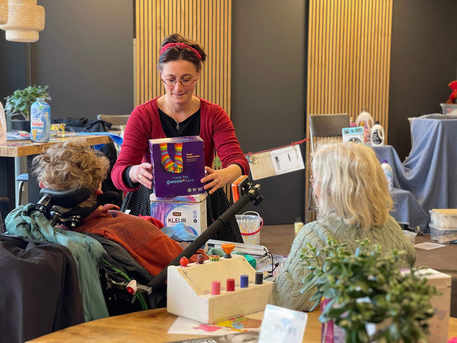 Tijdens de dag waren er twee workshops, verzorgd door Suus van ’t Belevingshuus. Het beleeftheater ‘Ooh kom maar eens kijken’ bleek een groot succes. Begeleid door gezellige Sinterklaasliedjes had pietje Suus verschillende belevingen in petto. Kinderen konden ruiken aan kruidnootjes, luisteren naar de bel van fietspiet, voelen aan de borstels van Ozosnel of zelf geluid maken met een fles gevuld met pepernootjes. Naast het beleeftheater bood de workshop ‘Doedels’ praktische inspiratie voor activiteiten in en rondom het huis. Hoe kun je simpele huishoudelijke spullen gebruiken om kinderen nieuwe prikkels en ervaringen te bieden? Denk bijvoorbeeld aan het ruiken van verschillende soorten wasmiddel of het maken van kleurrijke stapeltorens van lege verpakkingen.